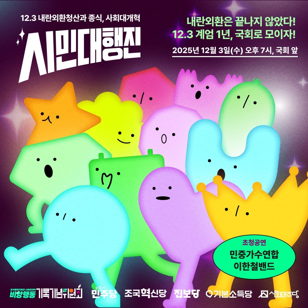 펌) ‼️내란은 끝나지 않았다! 12.3 계엄 1년, 국회로 모이자!‼️ 내란수괴 윤석열의 구속기간이 내년 1월 18일이면 만료됩니다. 이미 한 차례 내란수괴 윤석열의 구속 취소 결정을 단행한 지귀연 재판부가 의도적으로 재판을 지연시켜 다시 내란수괴가 거리를 활보하도록 하게 하려는 것은 아닌지 국민적 우려가 커지고 있습니다. 내란공범 한덕수는 최후변론에서 계엄을 막지는 못했지만 찬성하거나 도우려 한 일은 결단코 없다고 했습니다.