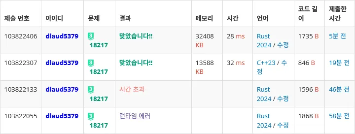 2초 문제에 완전 똑같은 로직으로 작성했는데 러스트는 빠른 입출력이 안돼서 TLE고 C++는 여유롭게 도네.... 억울하다