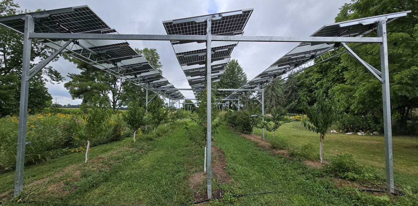 This is really interesting. The prevalent thinking is you put #solar panels on set-aside land not being used for anything else (or rooftops, of course). But actually creating a partial canopy of solar panels over crops can *improve* yields without losing farmland, the same sort of win win situation as you have with covering car parks: