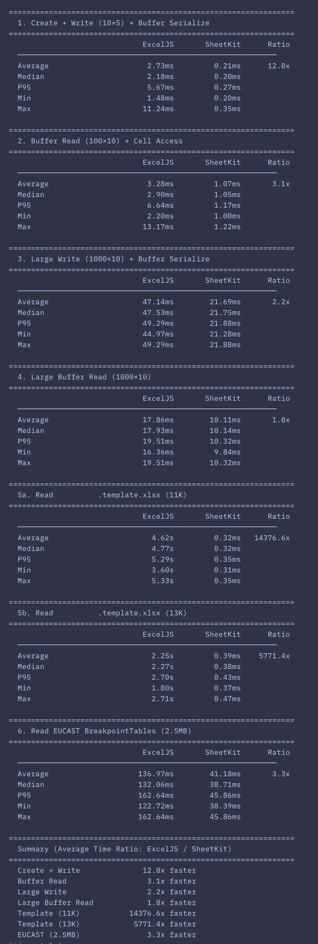 기존 ExcelJS를 쓰던 프로젝트에 SheetKit을 붙이다가 문득 궁금해져서 벤치마크 스크립트를 만들어보게 시켜보았다. 데이터 유효성 검사 설정을 많이 추가해둔 기존 템플릿 파일에서 SheetKit이 최대 10000배 이상 빠른 결과가 나왔다. 바퀴 재발명 야크 셰이빙이 뿌듯해지는 순간이다.