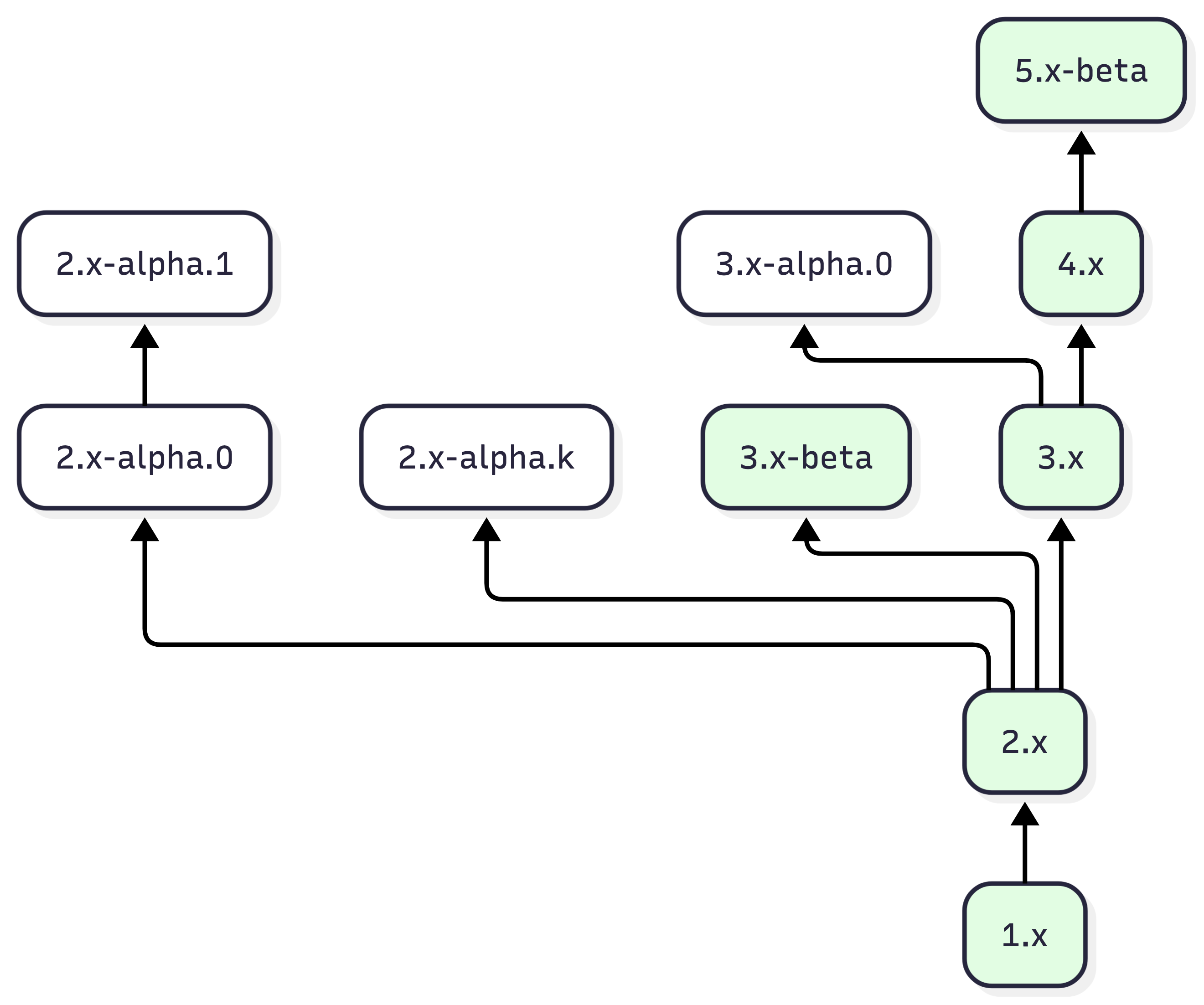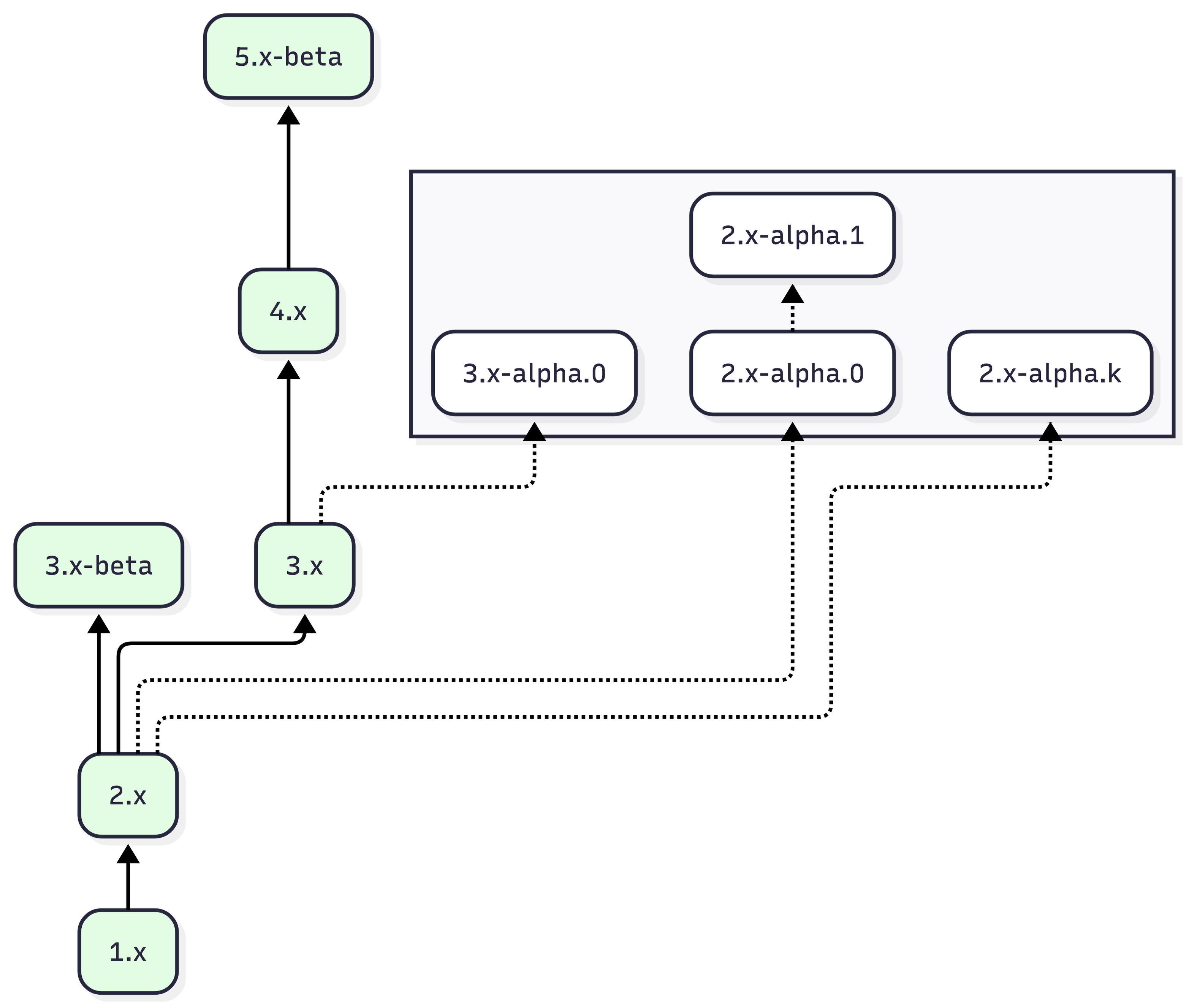 그런데 베타 버전(x.y-beta)과 알파 버전(x.y-alpha.z)을 고려해야 한다. 베타 버전에는 직전 버전에 대한 변환기가 있고, 알파 버전에는 변환기가 없다. 나이브하게 생각해보면 출발 버전 유형과 도착 버전 유형의 조합에 대해 모든 경우를 분기해서 경로를 구할 수 있을 것처럼 보인다.