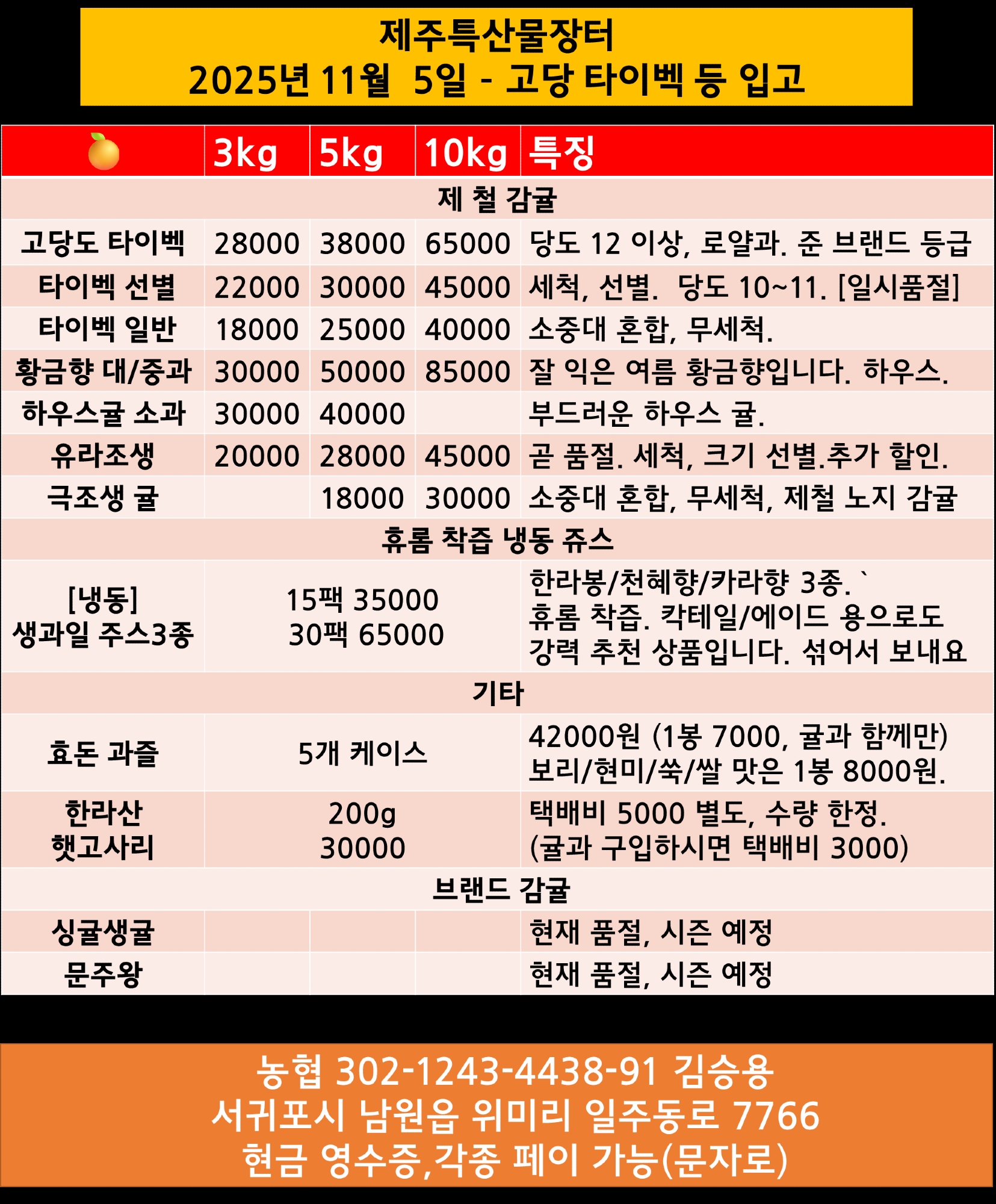 [제주감귤/RP할인] 11월 5일 가격표. 비교적 저렴한 일반 등급 감귤이 다양하게 나오기 시작했습니다.
