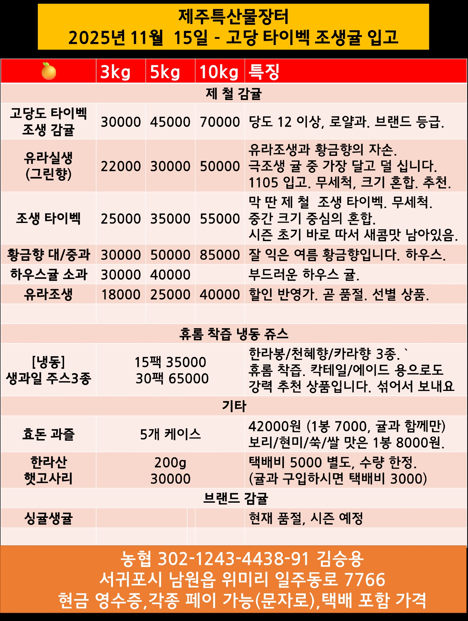 [제주감귤/RP할인] 11월 16일 가격표.