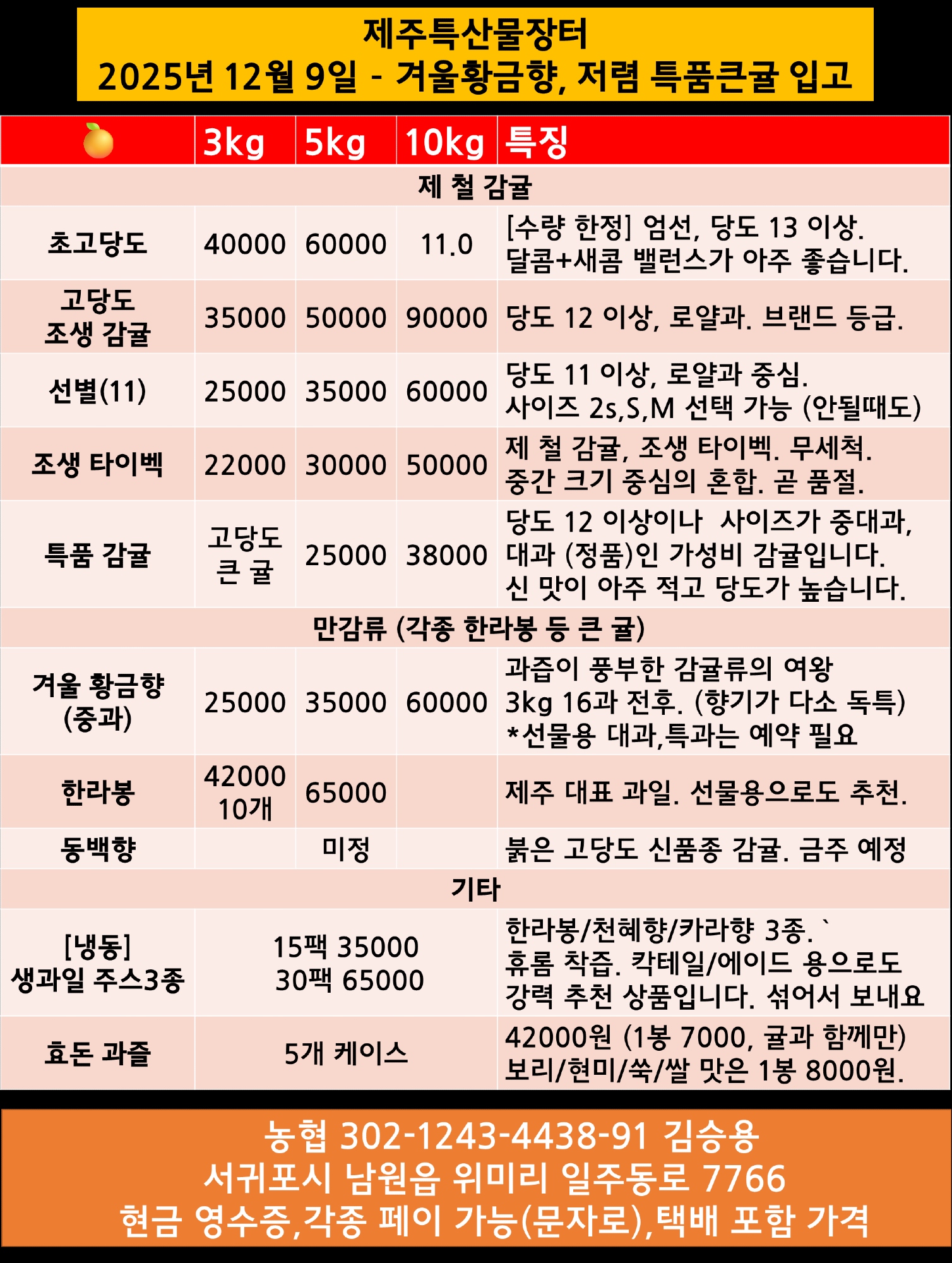 [랜선효도/제주감귤] 12월 9일 가격표입니다.