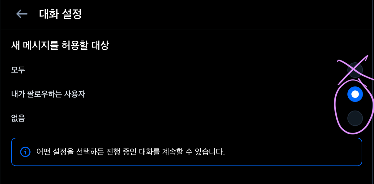 만약 블친이 아닌 분께 디엠을 받을 필요가 없다면 저렇게 설정해 놓으면 됩니다.