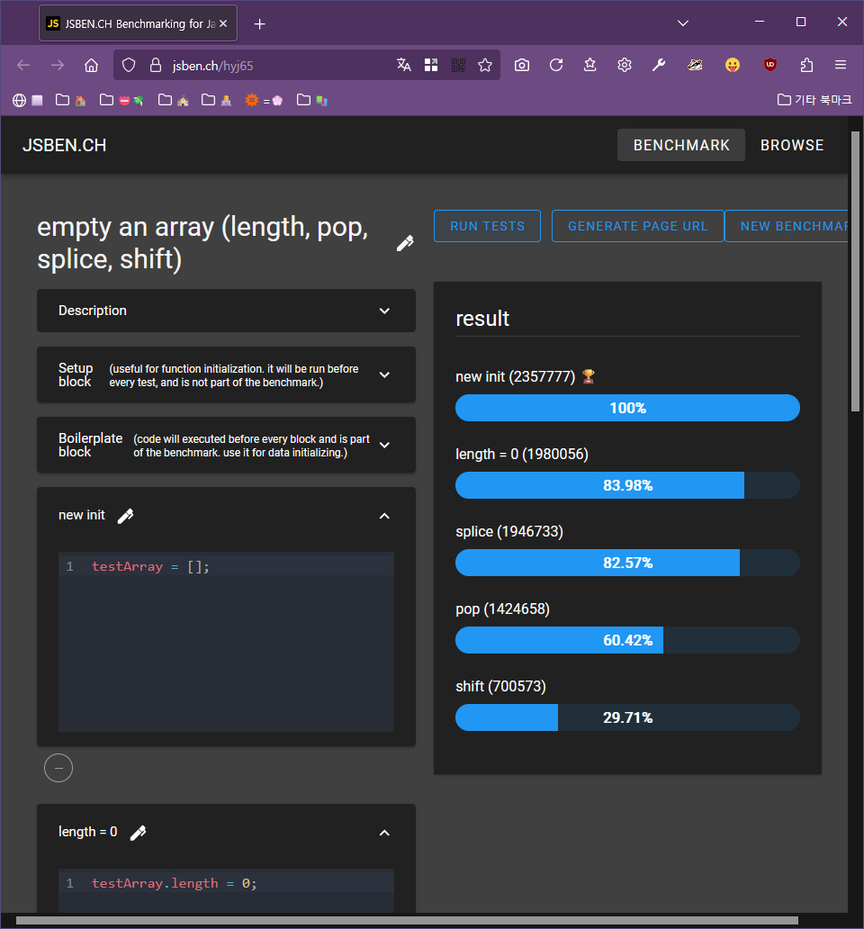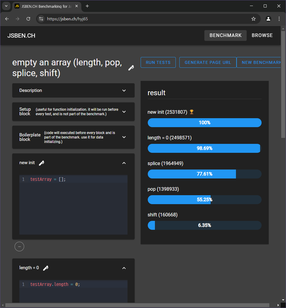 벤치마크를 돌려봤더니 실제로 .length = 0이 제일 빠르네요 😲 (← Firefox / Chromium →) jsben.ch/hyj65