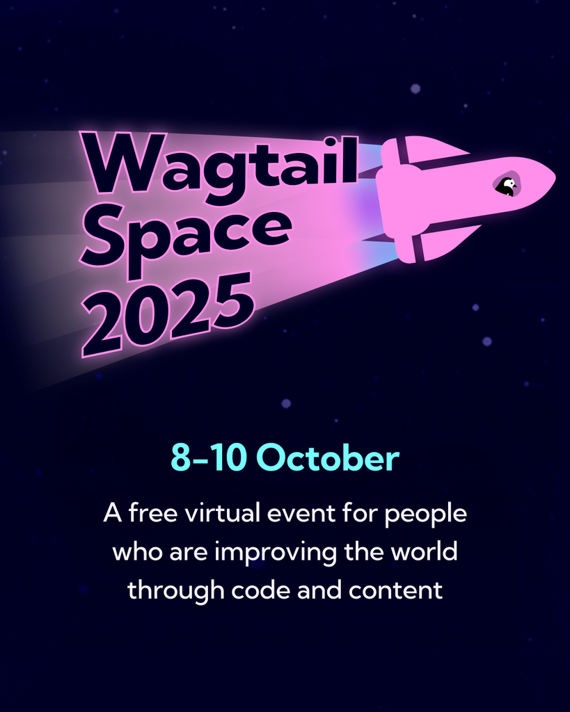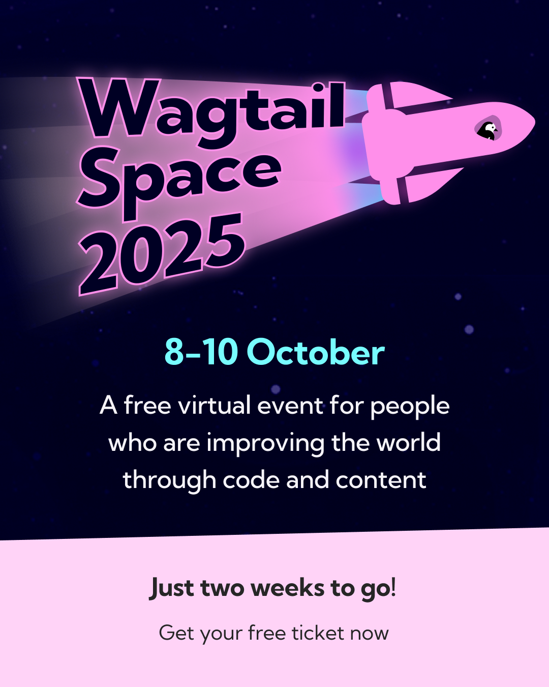 A pink rocketship with the words Wagtail Space 2025 behind. Below the rocketship the text says 8-10 October: A free virtual event for people who are improving the world through code and content.