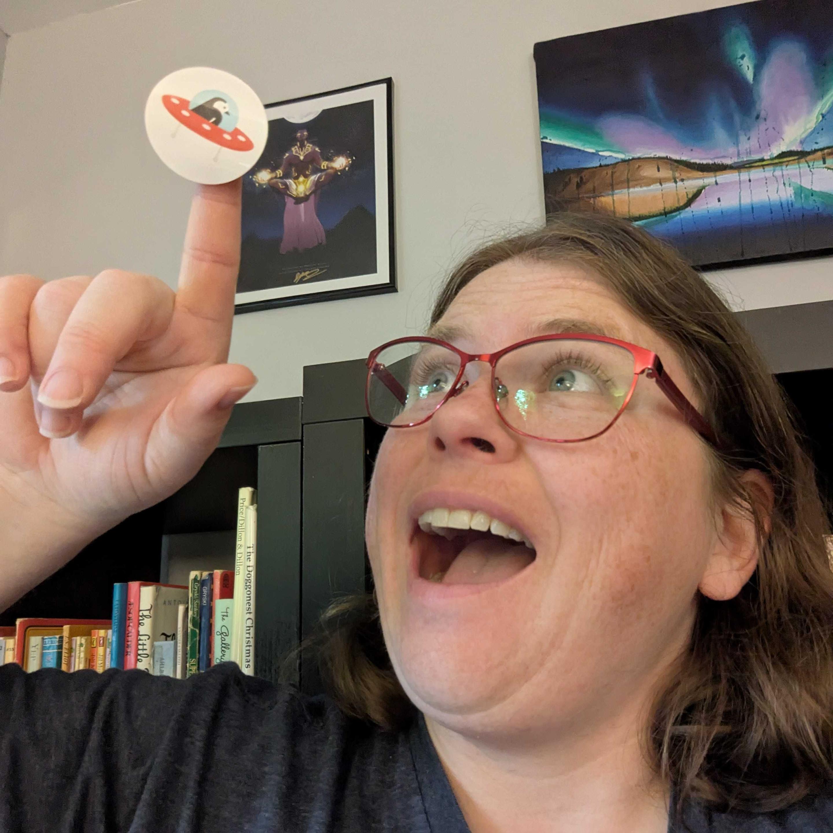 A woman with brown hair and pale, freckled skin looking up and smiling at a tiny spaceship with a bird in it flying over her head.