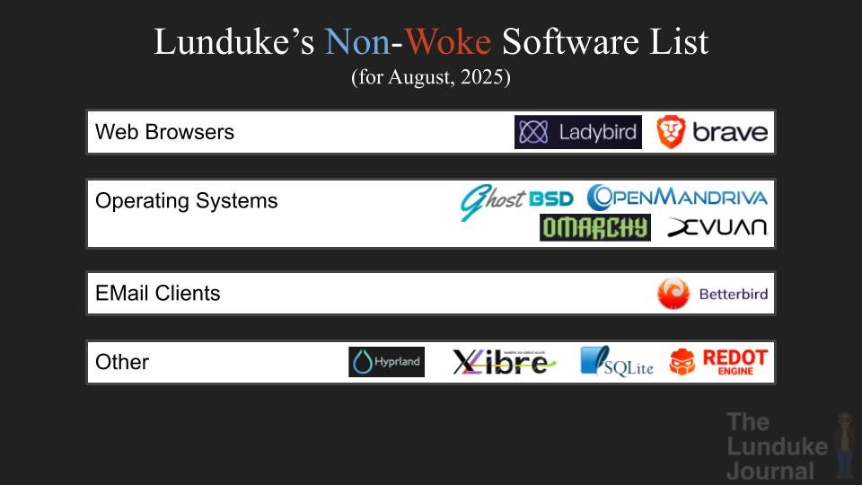 https://lunduke.substack.com/p/lundukes-non-woke-software-list-for