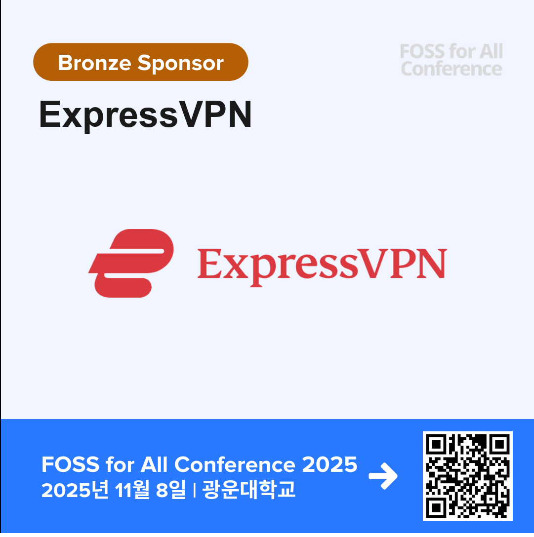 디지털 #프라이버시 와 #보안 을 선도하는 #ExpressVPN이 FOSS for All Conference 2025에 브론즈 #후원사 로 함께합니다. 🔐 오픈소스 #보안 #VPN 기술에 대해 자세히 알아보세요. 👉 참가 등록: https://event-us.kr/fossforall/event/110400 #FOSSforAll #보안 #개인정보보호 #VPN #OpenSourceSecurity